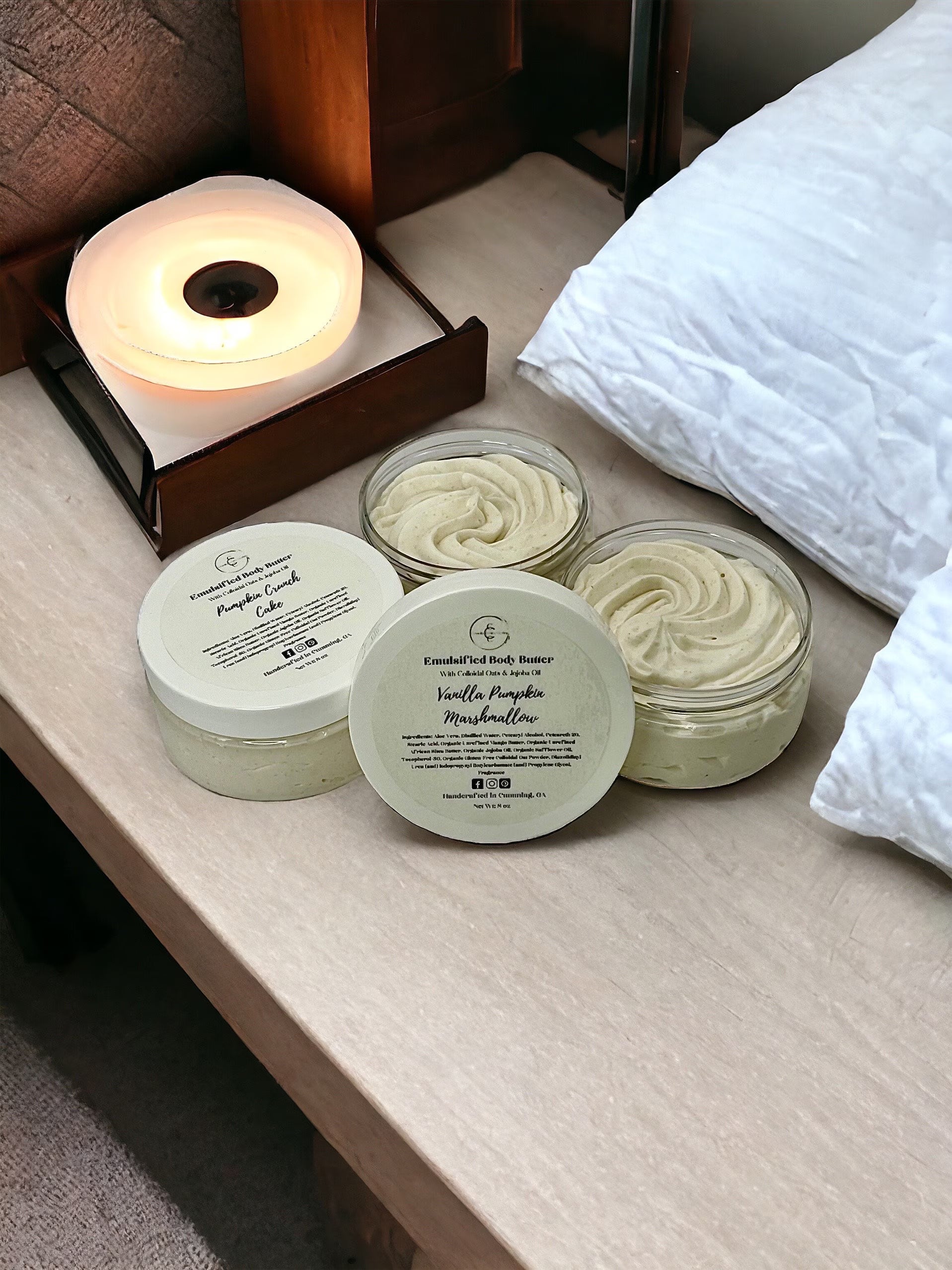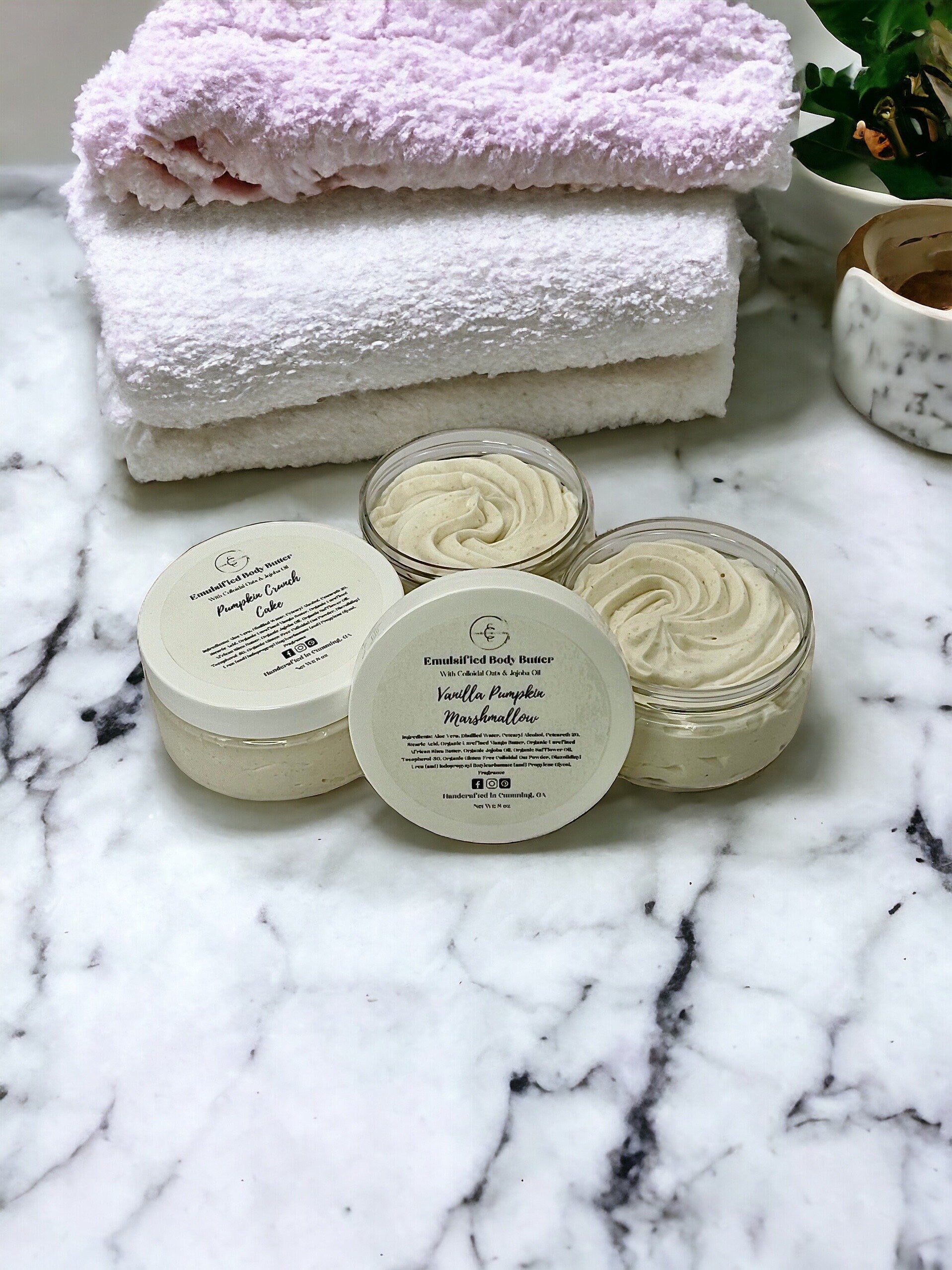 Water (Aqua), Aloe Barbadensis Leaf Water, Glyceryl Stearate (and) Cetearyl Alcohol (and) Sodium Stearoyl Lactylate, Cetyl Alcohol, Cetearyl Alcohol, Butyrospermum Parkii (Shea) Butter, Theobroma Cacao (Cocoa) Seed Butter, Simmondsia Chinensis (Jojoba) Seed Oil, Isopropyl Myristate, Cucumis Sativus (Cucumber) Fruit Extract, Avena Sativa (Oat) Extract, Hydrolyzed Oat Protein, Diazolidinyl Urea (and) Iodopropynyl Butylcarbamate, Fragrance (optional, if ordered).